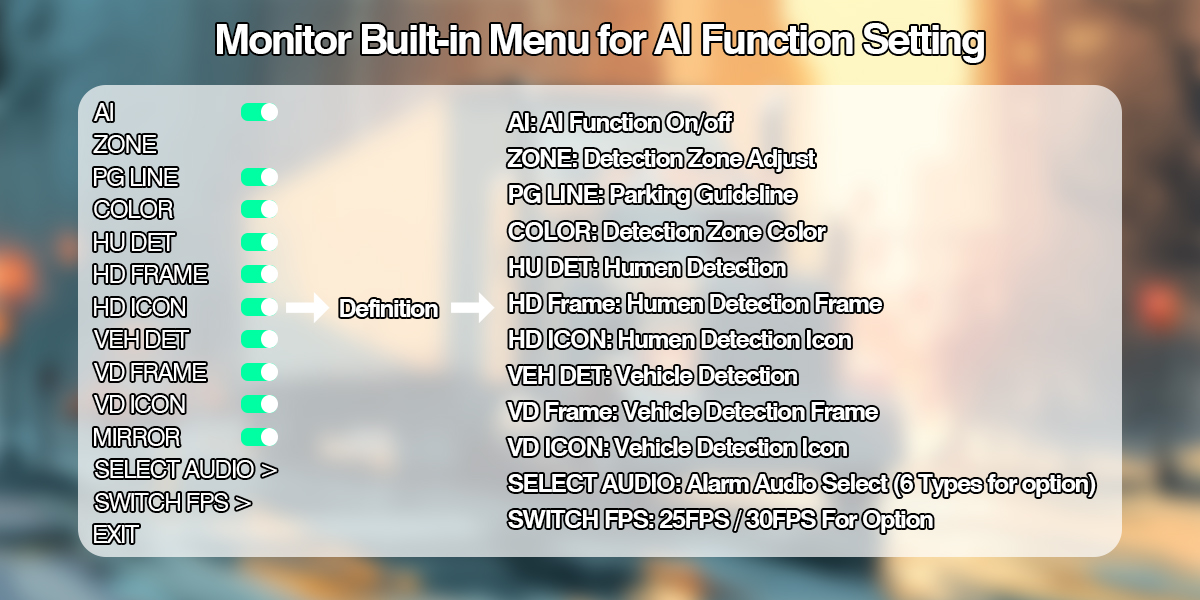 Вбудоване в монітор меню калібрування AI, всеКористувачі можуть вільно регулювати розмір області виявлення (зона виявлення) на екрані відповідно до різних умов перегляду, спричинених різним положенням і кутом встановлення. Окрім налаштування зони виявлення, є додаткові функції штучного інтелекту, які дозволяють користувачеві змінювати налаштування (перегляньте наступне зображення).