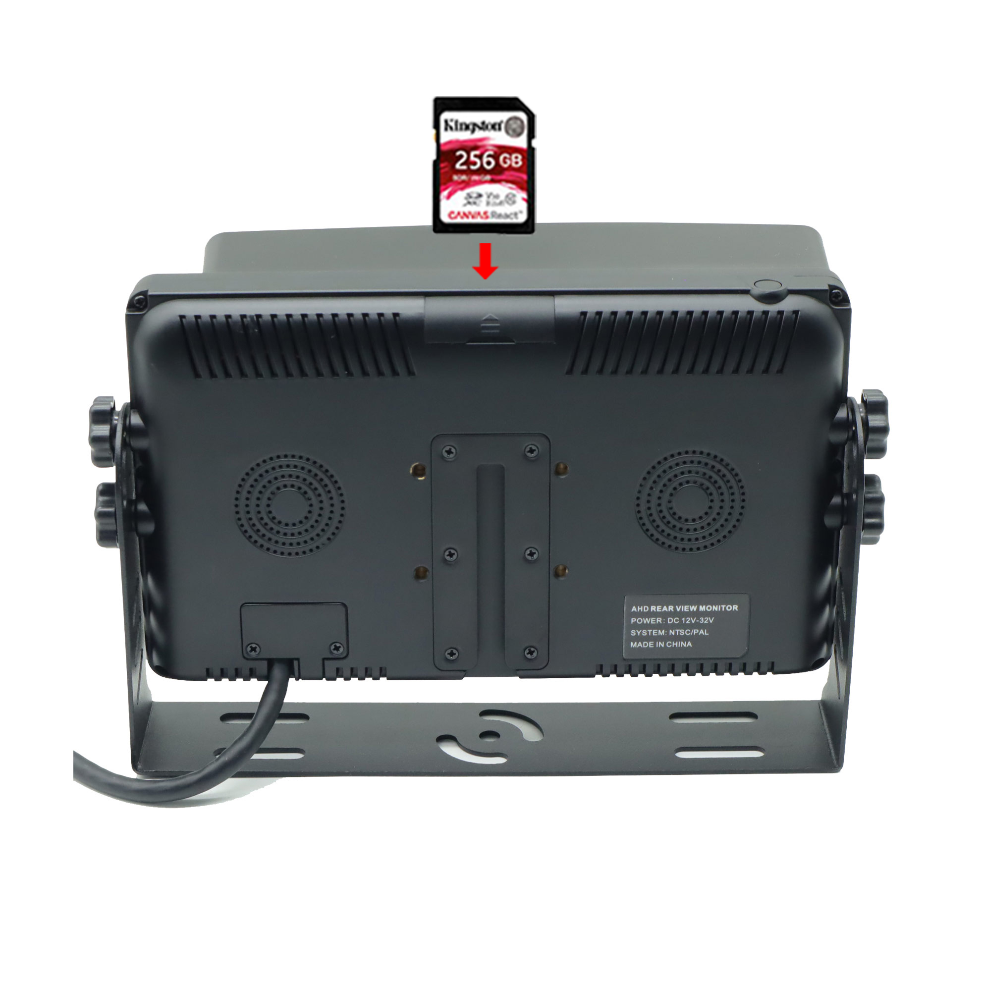 7-дюймовий 4-канальний AHD-вход Carleader з дисплеєм Quad View підтримує функцію запису DVR із слотом для SD-карти на задній панелі монітора, максимальна ємність до 256 ГБ. Функції з функцією циклічного запису, можуть автоматично записувати відео з камери та відтворювати.