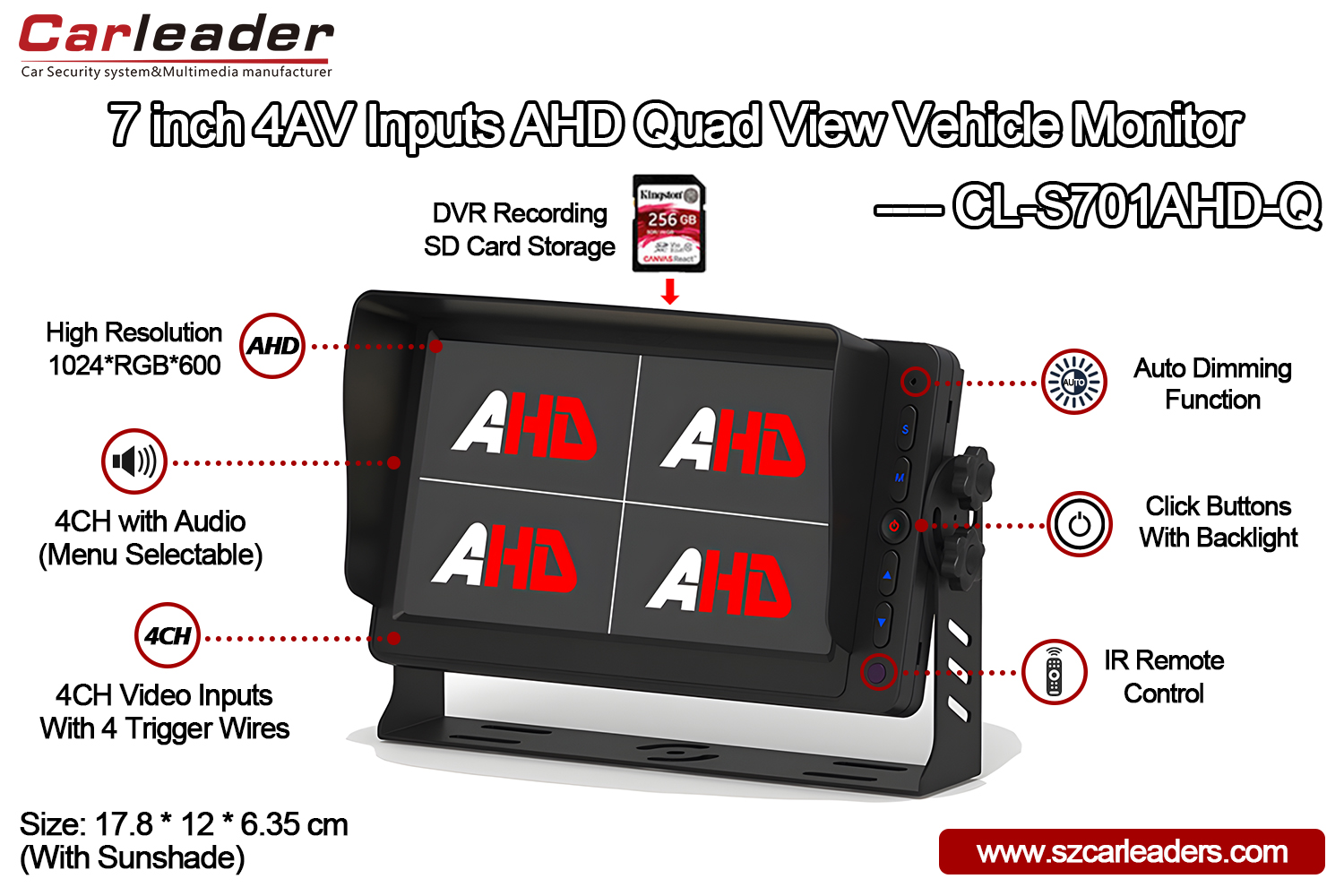 Carleader з гордістю представляє вам наш7-дюймовий 4-канальний монітор AHD із входами Quad View, чотириканальний дизайн може підтримувати 4 канали для камери транспортного засобу, наприклад, вид спереду, вид збоку x2, вид ззаду, що дозволяє водіям великогабаритних транспортних засобів (автобусів, вантажівок і фургонів) спостерігати за різними видами навколишнього середовища під час керування транспортним засобом.