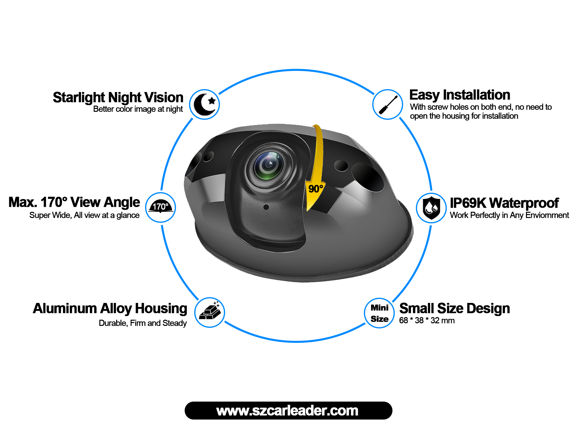 У сфері транспортних засобів CarleaderШирокий кут огляду AHD 170 градусів, водонепроникна камера резервного копіювання для важких умовшироко використовуються у вантажівках, автобусах, шкільних автобусах, інженерному обладнанні RV та інших важких транспортних засобах. Її можна використовувати як камеру переднього, бічного та заднього виду, і навіть поєднувати з MDVR для запису відео, віддаленого моніторингу, керування автопарком та інших функцій