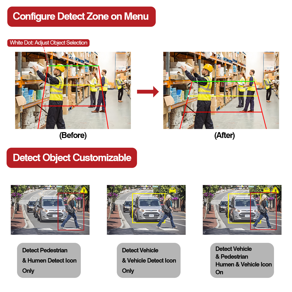 Ця камера зі штучним інтелектом із вбудованою функцією попереджувального світла змінює колір світла на відповідний, коли об’єкт виявлення потрапляє в іншу зону виявлення (червоний, жовтий, зелений). Також інтегруйте з сигналізацією, щоб сигналізувати про навколишніх пішоходів і транспортних засобів, які наближаються до вашого автомобіля.