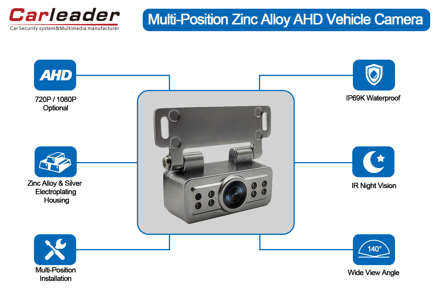КарлідерАвтомобільна камера заднього виду AHD зі срібним гальванічним покриттям, з корпусом із цинкового сплаву та срібним гальванічним покриттям, широким кутом огляду 140 градусів та захистом від води та пилу IP69K. Кут установки і положення також можна зафіксувати гвинтами.