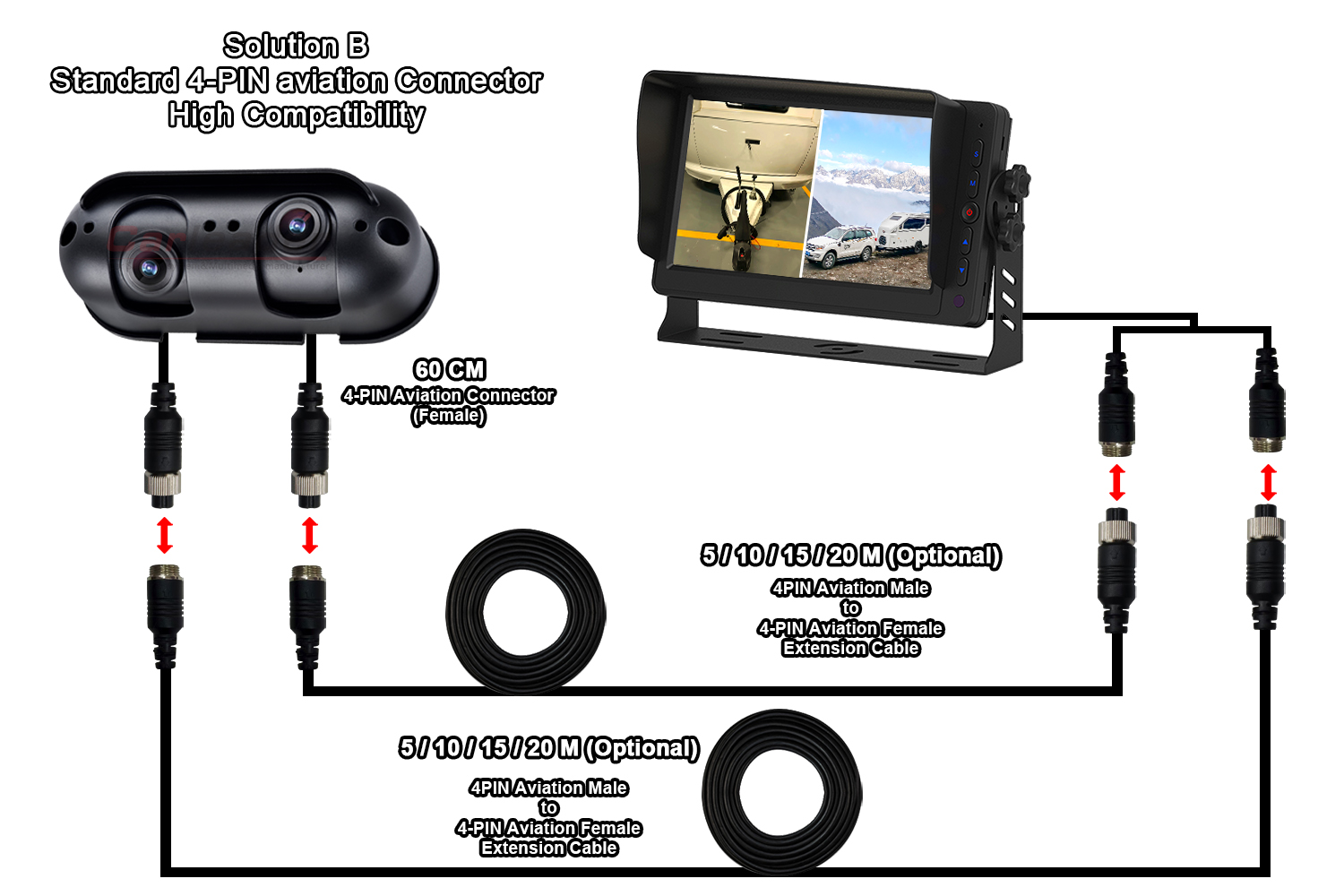 Карлідерзапропонує два варіанти підключення для камери заднього виду AHD Starlight із подвійним об’єктивом, яка підходить для будинку на колесах, щоб відповідати різним потребам у проводці: