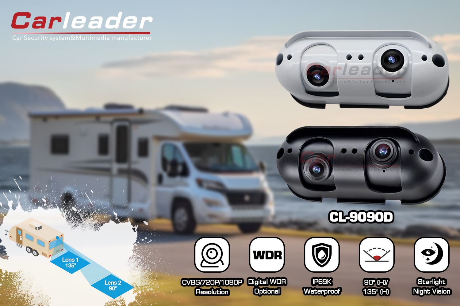 КарлідерКамера заднього виду AHD Starlight із подвійним об’єктивом підходить для будинку на колесах, приватна камера заднього виду AHD від Carleader, конструкція з подвійним об’єктивом дозволяє користувачеві мати чітку видимість на близькій і дальній відстані. Корпус із алюмінієвого сплаву та рейтинг IP69K роблять камеру міцнішою та довговічнішою за будь-яких суворих погодних умов. Ця камера підходить не лише для важких транспортних засобів, таких як вантажівка, автобус, навантажувач тощо; також підходить для автомобілів на колесах, таких як автофургони та каравани.
