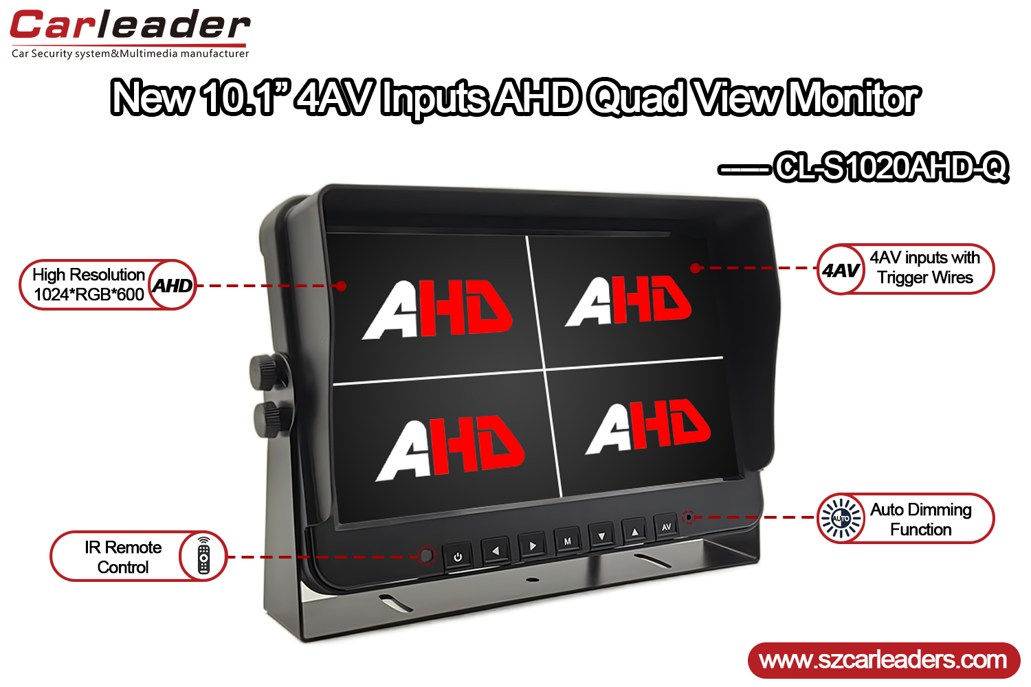 Ідеально підходить для транспортних засобів, безпеки та промислового моніторингу,10,1-дюймовий 4-канальний 4-канальний монітор AHD для важких транспортних засобів Carleaderпоєднує в собі надійну функціональність, чітку якість відображення та настроювані користувачем параметри в компактному та міцному корпусі.