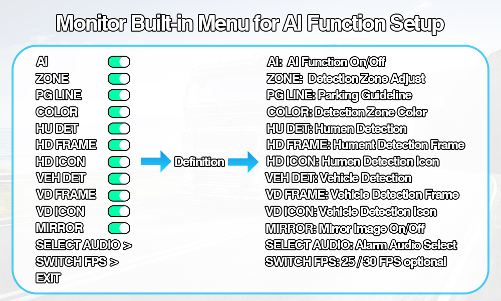 Настроюване калібрування штучного інтелекту: легко регулюйте зони виявлення штучного інтелекту за допомогою інтуїтивно зрозумілого екранного меню монітора, а також можна вибрати стеження лише за пішоходами, лише за транспортними засобами або обома — за допомогою ввімкнення/вимкнення рамки виявлення та накладання значка об’єкта (пішохід або транспортний засіб) для чіткого візуального зворотного зв’язку.